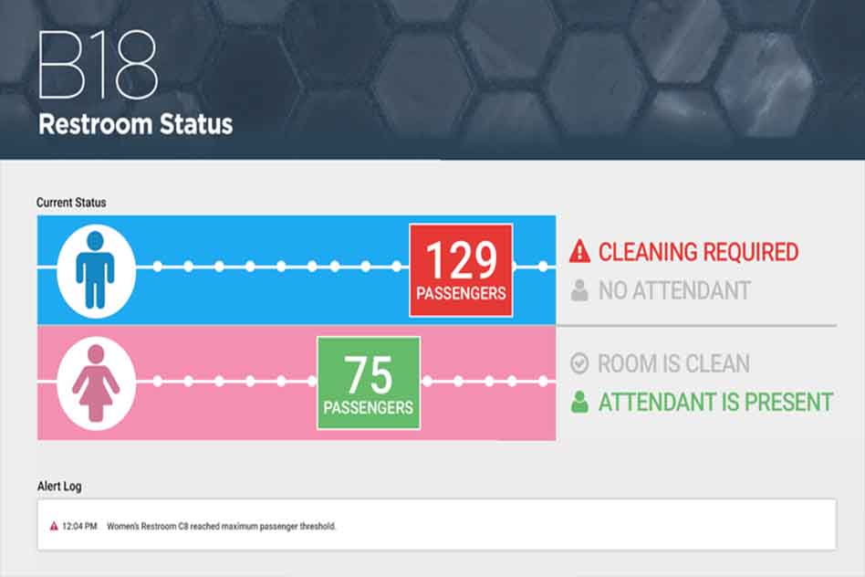 The solution includes the SmartRestroom Business Intelligence Platform and user interface. The Business Intelligence Platform allows transit facilities to view current data for all restrooms in the SmartRestroom system, as well as passenger and janitorial staff information in the form of graphs and charts. The user interface allows authorized users to view detailed information about the restrooms and janitorial staff, including passenger throughput, cleaning time stamps, staff activity, and the alert log.